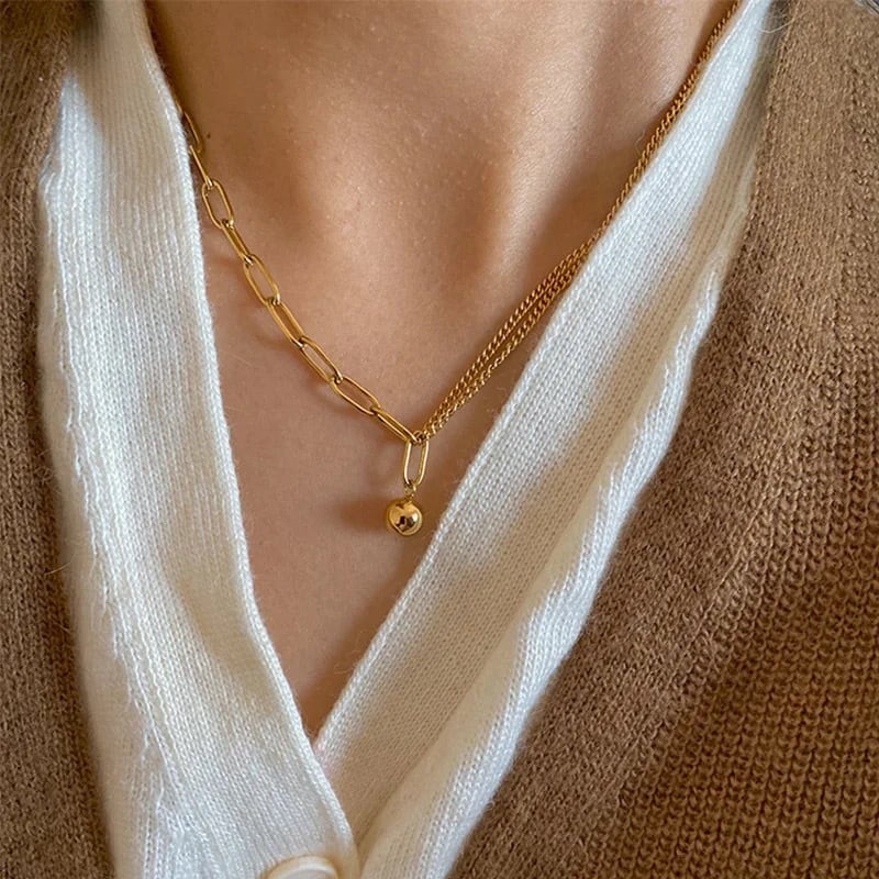 洗練された2連チェーンにメタルボールが揺れる、さりげなく存在感のあるネックレス。