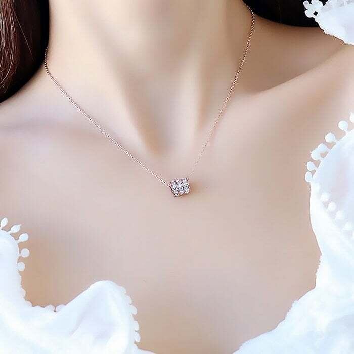 3つのミニマルリングが胸元で揺れ、きらめきを重ねる上品デザイン。