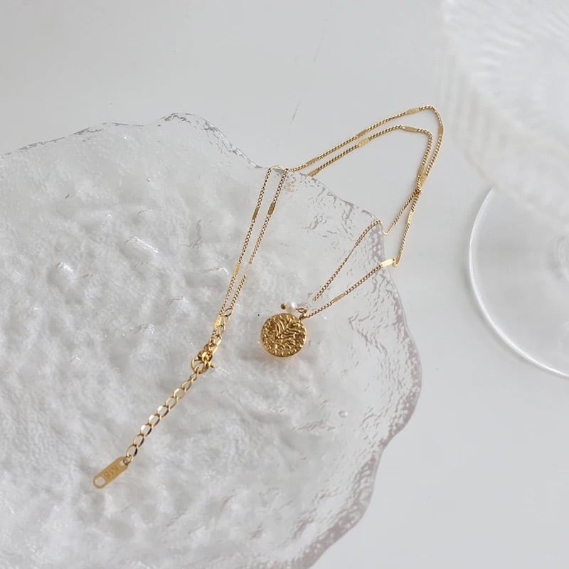 柔らかな光を反射するコインチャームが、デコルテを上品に彩る大人のためのネックレス。