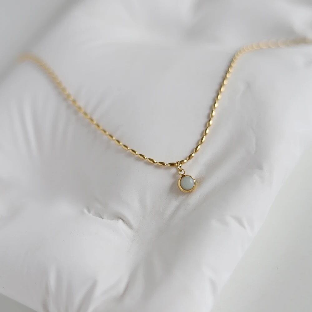 繊細なチェーンに、やわらかな光を放つ小さなオパールチャームを添えた上品ネックレス。