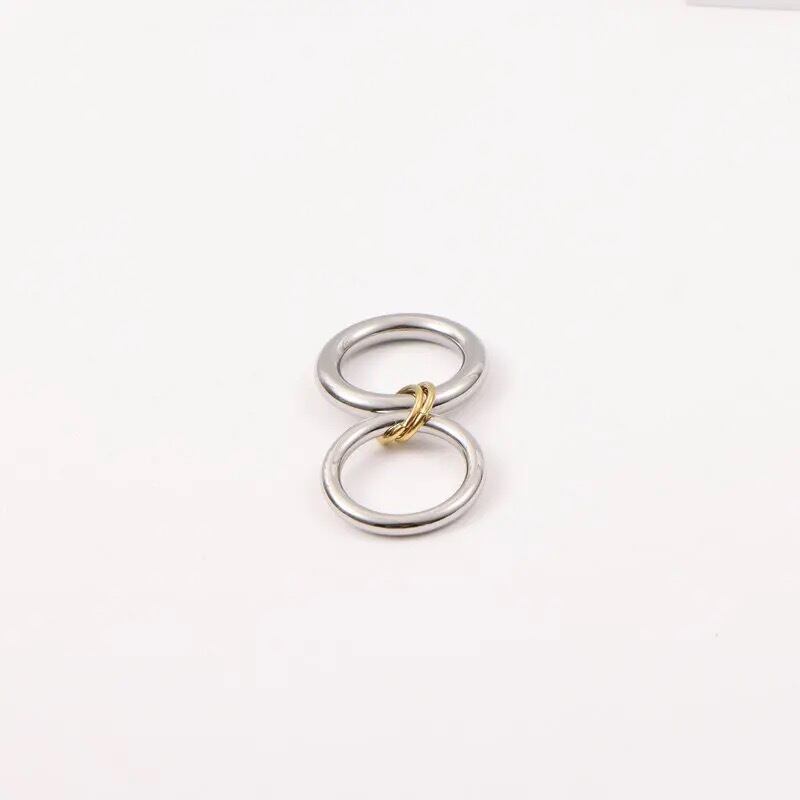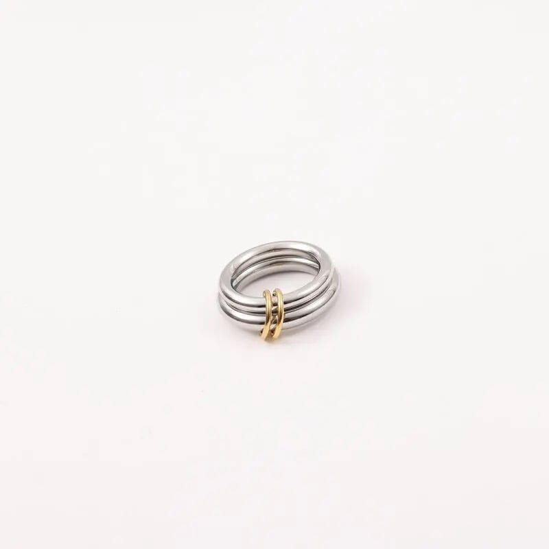 シルバーとゴールドのリングが美しく絡み合う、モダンでミニマルなデザイン。