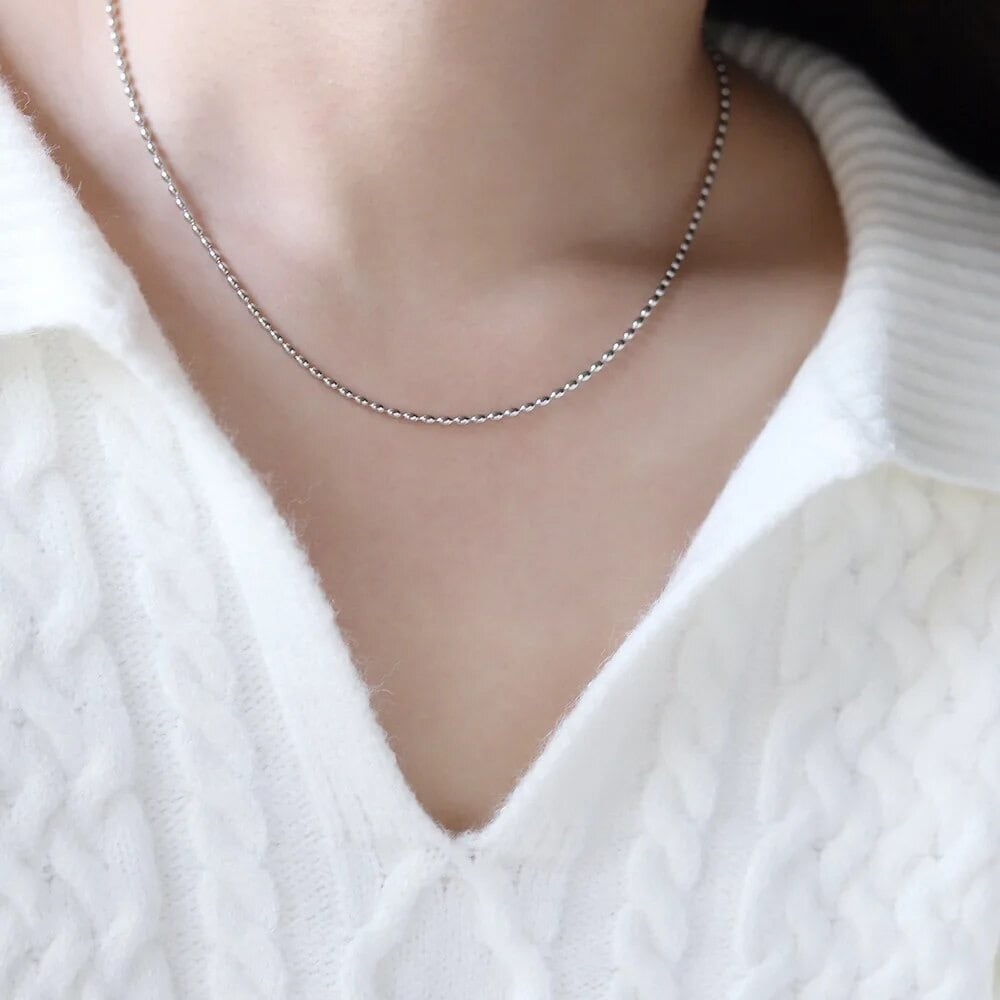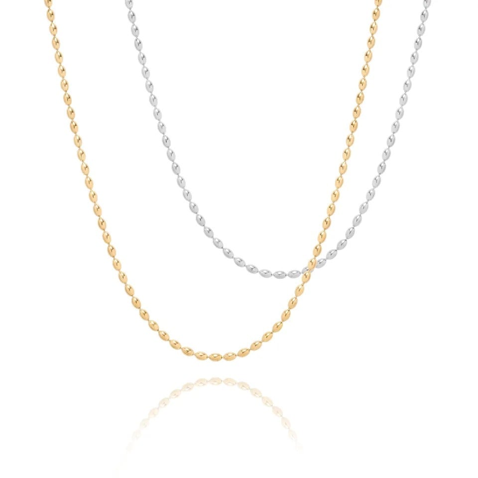 小粒のライス型チェーンが首元にさりげない輝きを添えてくれる一本。