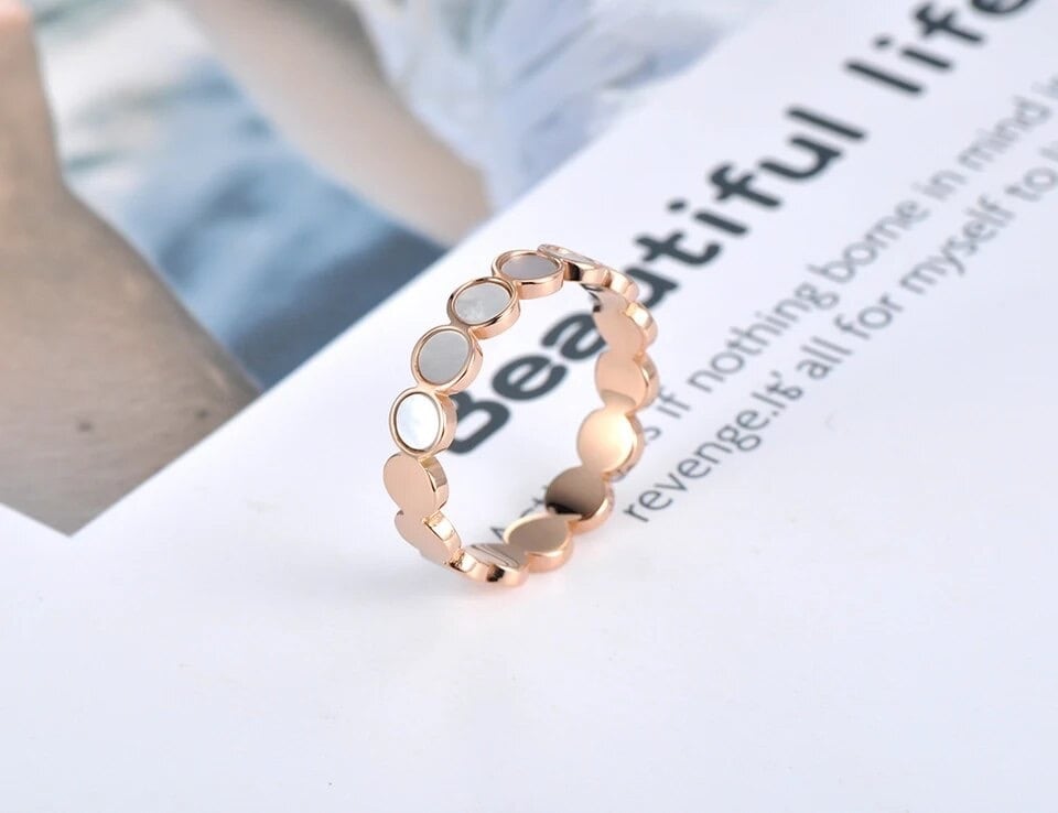 月のようにやさしく輝く、ミルキーなシェルが並ぶ上品リング。