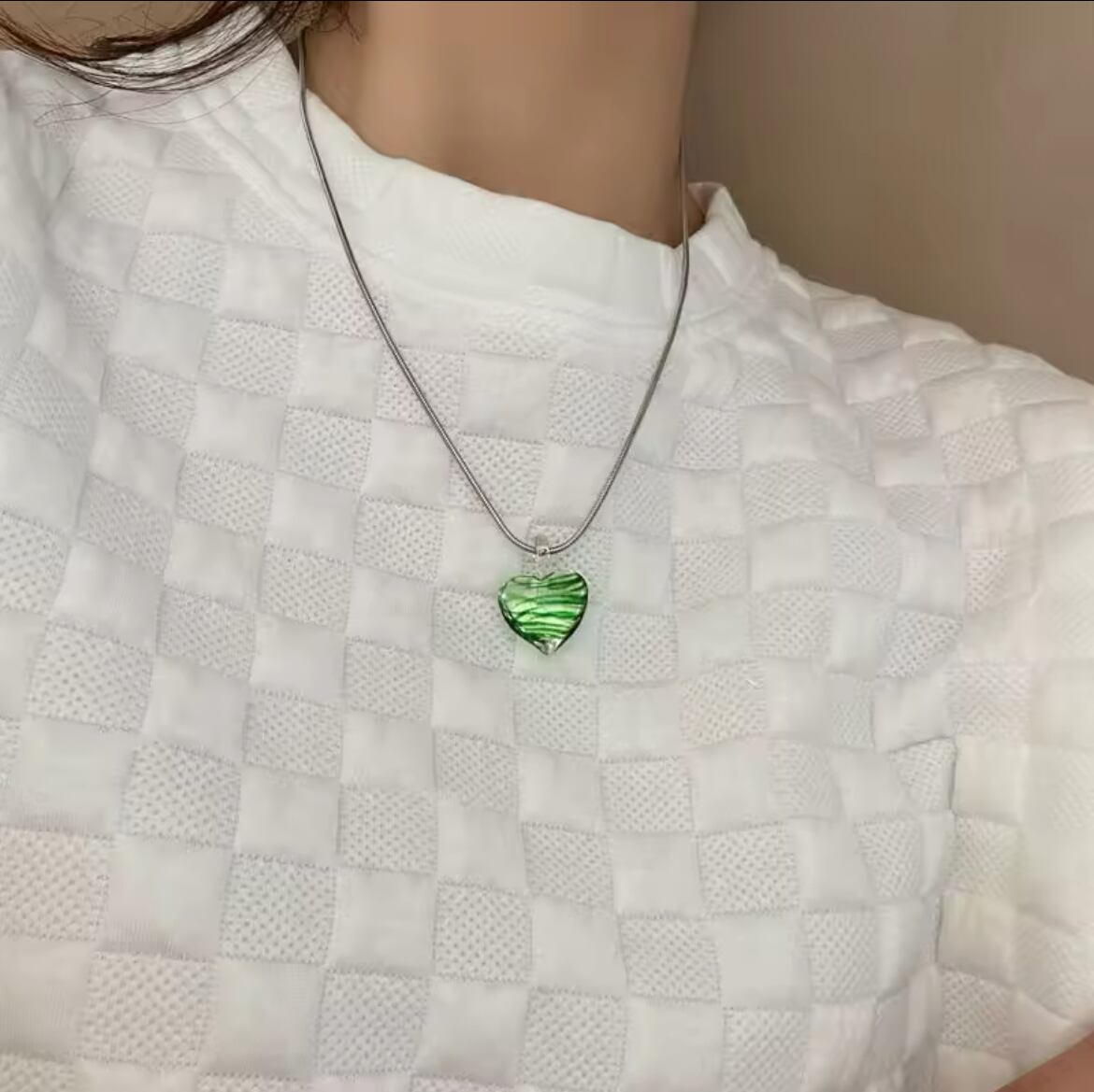 ひとつひとつ模様の違う、ガラスハートが胸元できらり。